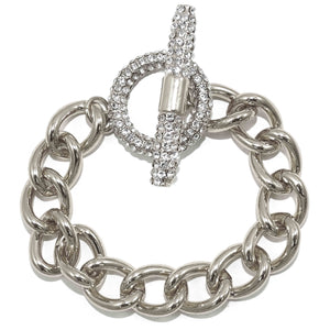Fashionable oversized cuban link chain bracelet showcasing large toggle clasp decorated in pave cubic zirconia gemstones in 18k white gold plating over brass.